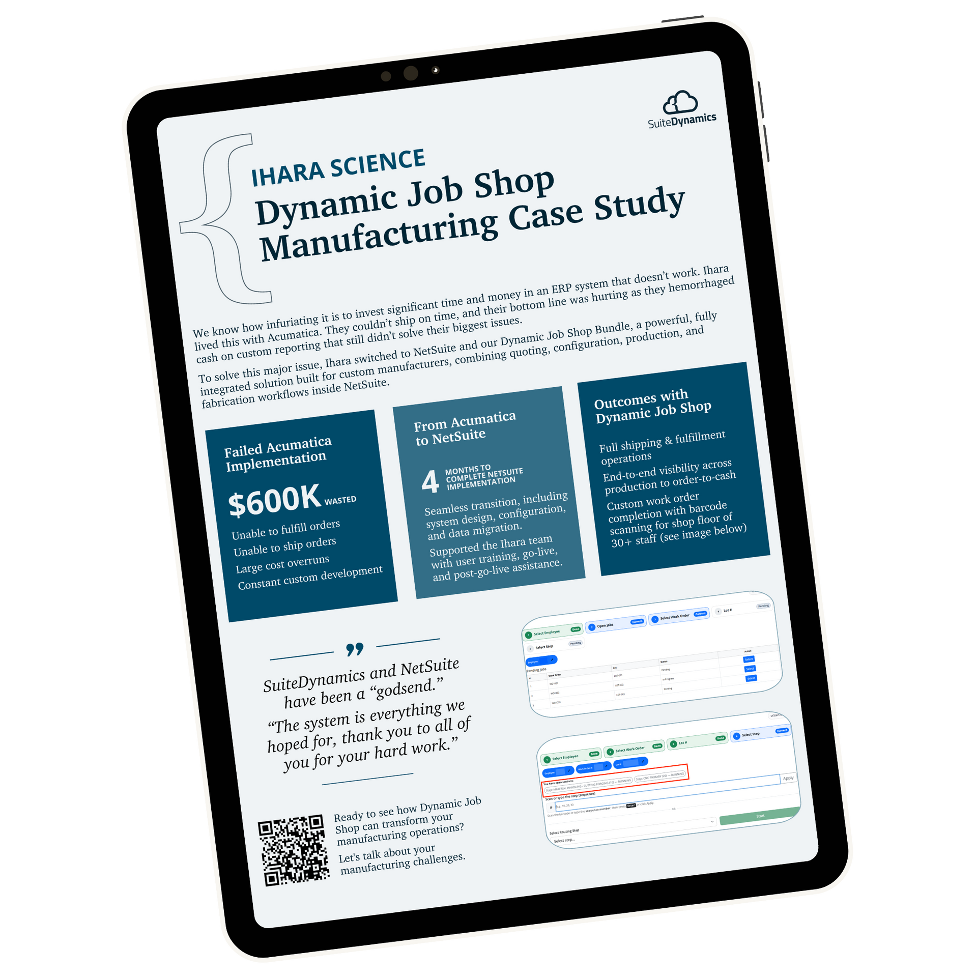 Standard NetSuite isn't designed for the complex, custom nature of job shop manufacturing. While it works well for high-volume, repetitive production, job shops need specialized solutions for make-to-order manufacturing, complex quoting, and real-time shop floor management.